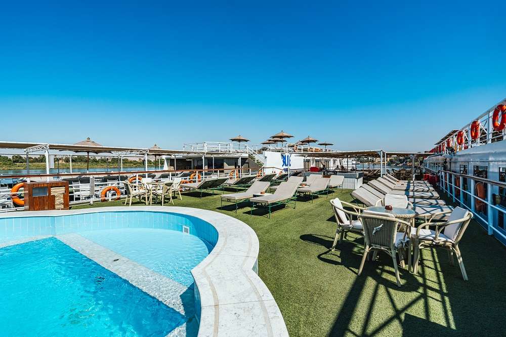 Терраса у бассейна с баром и удобными шезлонгами – место на самой верхней палубе, где можно принять солнечные ванны, читая культовый роман Агаты Кристи о нильском круизе. А после – окунуться в прохладную воду бассейна, и, потягивая напиток, насладиться великолепным видом на Нил.