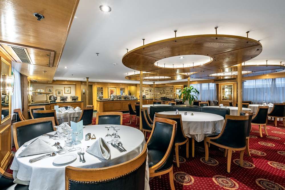 Главный ресторан теплохода достаточно просторный, чтобы вместить всех пассажиров одновременно. Еда сочетает в себе мировой гастрономический опыт и национальный темперамент. Вы сможете попробовать блюда международной, египетской и восточной кухни. Меню предоставляется на русском языке.