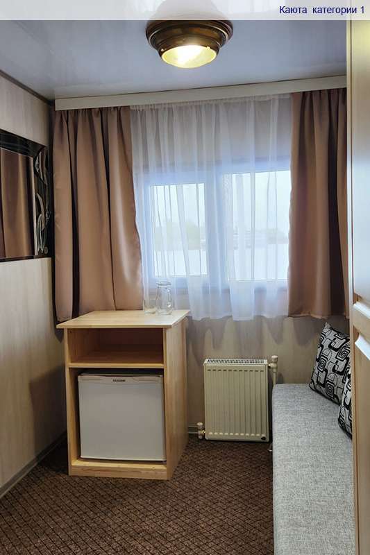 1 (№ 3, 4, 9): 1-местная каюта на средней палубе. ⇒ душ, туалет, умывальник (гор/хол вода), спальное место, возможность размещения дополнительного туриста, кондиционер, холодильник В каюте: спальное место раскладной диван шириной 1,40 м (возможно размещение дополнительного туриста), шкаф, стул, стол, полка, настольная лампа, кондиционер, зеркало, холодильник, розетки 220V, радио, туалетные принадлежности (шампунь, мыло, гель для душа), обзорное окно.