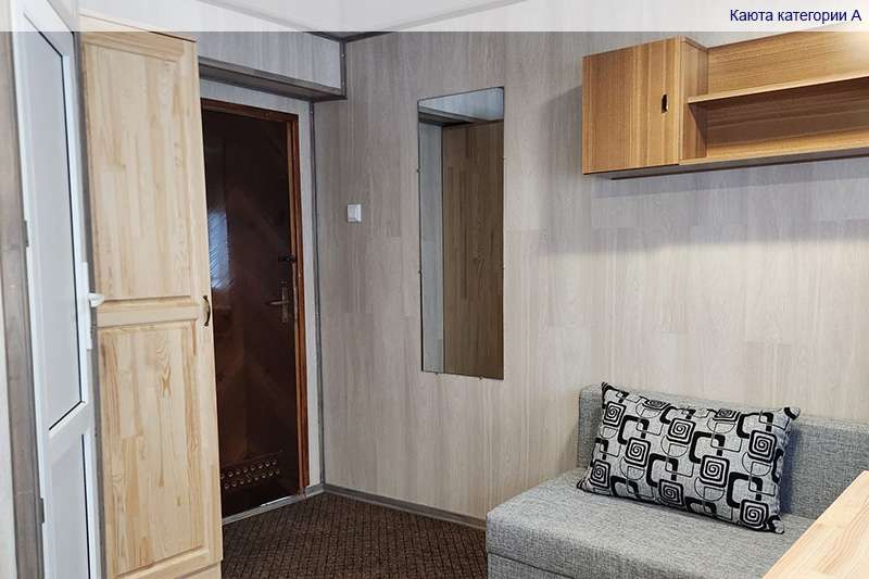 А (№ 1, 2, 5, 6, 7, 8, 10, 11, 12, 14, 15, 16, 17, 18, 20, 21, 23): 2-местная 1-ярусная каюта на средней палубе. ⇒ душ, туалет, умывальник (гор/хол вода), совместные спальные места, раздельные спальные места, возможность размещения дополнительного туриста, увеличенная площадь каюты, кондиционер, холодильник В каюте: спальное место два раскладных дивана шириной 1,40 м (возможно размещение дополнительных туристов), шкаф, стул, стол, полка, настольная лампа, кондиционер, зеркало, холодильник, розетки 220V, радио, туалетные принадлежности (шампунь, мыло, гель для душа), два обзорных окна. *Каюта №10 в санузле из-за технологических особенностей ощущается повышенная вибрация и тепло.