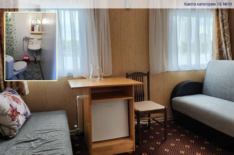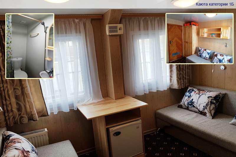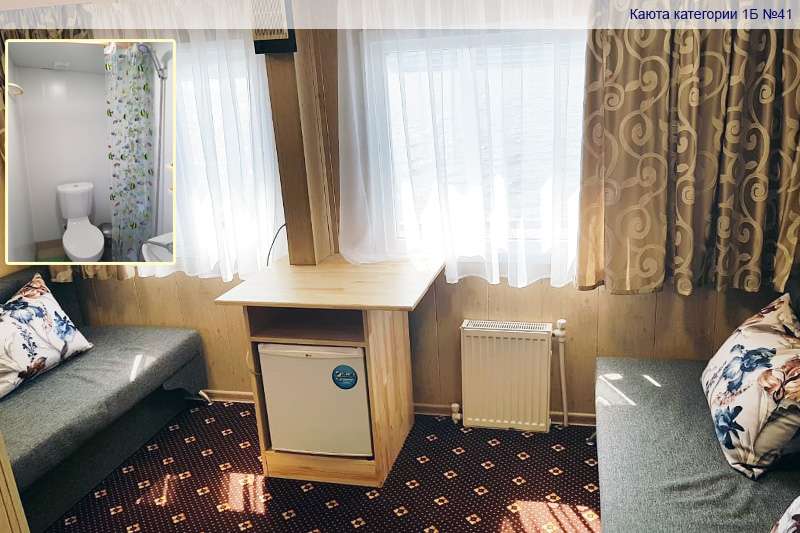 1Б (№ 36, 38, 39, 40, 41, 42, 43, 44, 45, 47): 2-местная каюта на главной палубе с 1 или 2 доп местами. ⇒ душ, туалет, умывальник (гор/хол вода), совместные спальные места, раздельные спальные места, возможность размещения дополнительного туриста, кондиционер, холодильник каюты № 36, 41 (размещение до 4-х человек) В каюте: спальное место два раскладных дивана шириной 1,40 м (возможно размещение дополнительных туристов), шкаф, стол, полка, настенные светильники, кондиционер, зеркало, холодильник, розетки 220V, радио, туалетные принадлежности (шампунь, мыло, гель для душа), обзорное окно. Каюта № 39 (размещение до 3-х человек) В каюте: спальное место двуспальный диван (140*200), одно дополнительное место (диван), шкаф, стол, полка, настенные светильники, кондиционер, зеркало, холодильник, розетки 220V, радио, туалетные принадлежности (шампунь, мыло, гель для душа), два обзорных окна. Каюты № 38, 40, 42, 43, 44, 45, 47 (размещение до 3-х человек) В каюте: спальное место два дивана, один из них раскладывается шириной 1,40 м (возможно размещение дополнительного туриста), шкаф, стол, полка, настенные светильники, кондиционер, зеркало, холодильник, розетки 220V, радио, туалетные принадлежности (шампунь, мыло, гель для душа), два обзорных окна. *В каютах № 45, 47 ощущается повышенная вибрация от машинного отделения