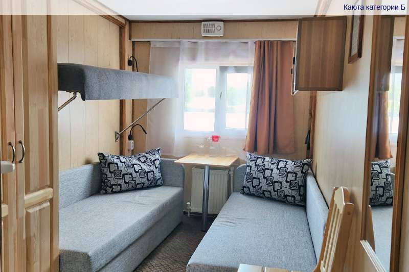 Б (№ 24-35): 2-местная 1-ярусная каюта на главной палубе с 1 или 2 доп. местами. ⇒ душ, туалет, умывальник (гор/хол вода), раздельные спальные места, возможность размещения дополнительного туриста каюты № 24-33 (размещение до 3-х человек) В каюте: два спальных места нижнего расположения, и одно спальное место верхнего расположения (возможно размещение 1-го дополнительного туриста), шкаф, столик, полка, настольная лампа, зеркало, розетки 220V, радио, туалетные принадлежности (шампунь, мыло, гель для душа), обзорное окно. Каюты № 34, 35 (размещение до 4-х человек) В каюте: два спальных места нижнего расположения, и два спальных места верхнего расположения (возможно размещение 2-х дополнительных туристов), шкаф, столик, настольная лампа, зеркало, розетки 220V, радио, туалетные принадлежности (шампунь, мыло, гель для душа), обзорное окно.