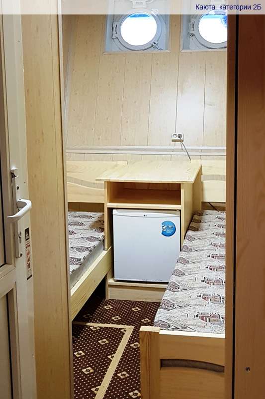 2Б (№46, 48, 49, 51): 2-местная 1-ярусная каюта на нижней палубе. ⇒ душ, туалет, умывальник (гор/хол вода), раздельные спальные места, холодильник В каюте: две односпальные кровати, шкаф, столик, холодильник, радио, розетки 220 V, два иллюминатора.