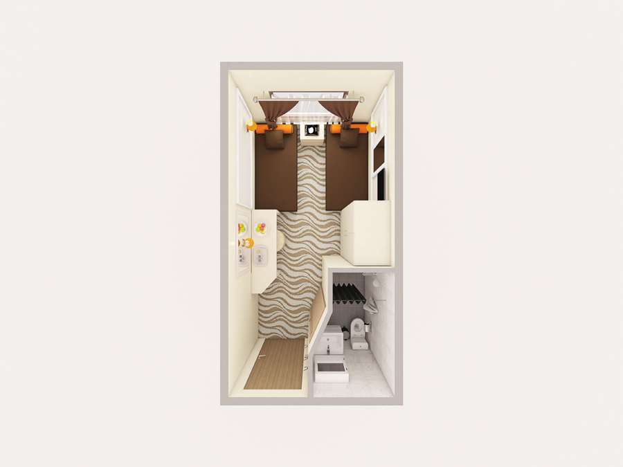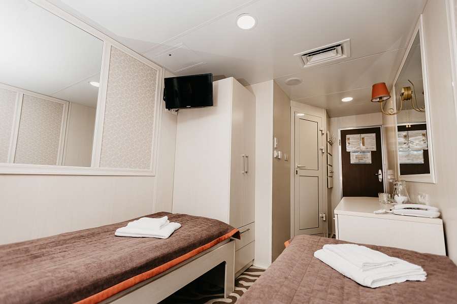 А2 комфорт К категории А2 комфорт относятся каюты: 313–354, 361, 362. Двухместная каюта со всеми удобствами, расположенная на средней палубе. Площадь каюты от 9,2 до 9,6 м².