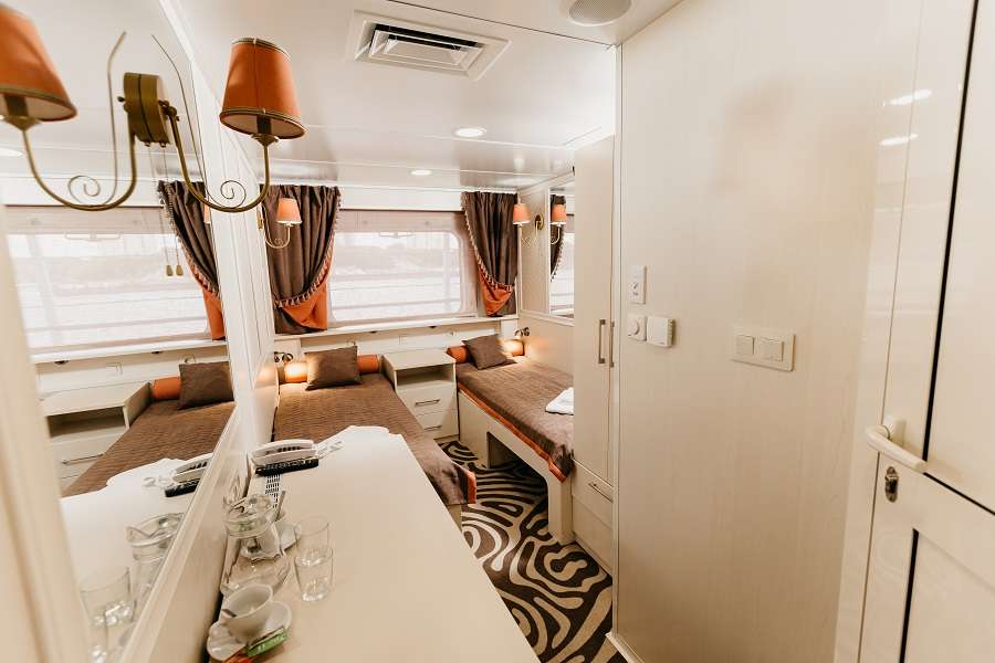 В каютах теплохода могут с комфортом разместиться до 300 гостей. На средней палубе модернизированы 50 кают: со сменой планировки, дизайна, всей мебели и отделки. Увеличена площадь санузла, где выделена отдельная зона для душевой. Каюты относятся к категории А2 комфорт. Часть кают оборудована балконами. 20 «Полулюксов» с балконами названы в честь знаменитых артистов балета.