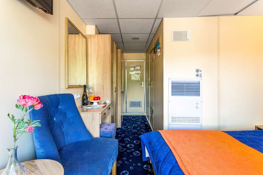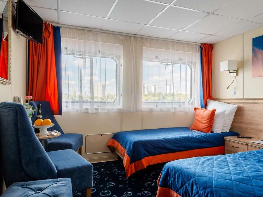 Полулюкс Б-С НОВИНКА 2025 К категории Полулюкс Б-С относятся каюты: 203–205, 210, 211, 213, 214, 216, 219, 222, 223. Двухместная каюта увеличенной площади со всеми удобствами, расположенная на главной палубе. Площадь каюты ≈ 13,8 м². Возможно размещение третьего человека на дополнительном месте – кресло-кровать. Размер дополнительного места: 190 см длина и 75 см ширина. Размещение ребенка до 5 лет без места и питания, при наличии свободного дополнительного места, производится только по согласованию с судоходной компанией. В каюте 216 кровать не раздвигается.
