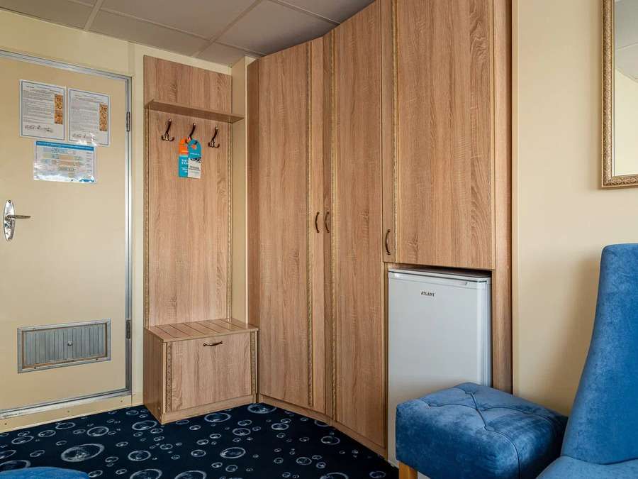 ПК-С НОВИНКА 2025 К категории ПК-С относятся каюты: 201, 202, 207–209, 212, 215, 217, 218, 220, 221. Двухместная каюта увеличенной площади со всеми удобствами, расположенная на главной палубе. Площадь каюты 12,2 м². Возможно размещение третьего человека на дополнительном месте – верхняя полка. Размер дополнительного места: 190 см длина и 75 см ширина. Размещение ребенка до 5 лет без места и питания, при наличии свободного дополнительного места, производится только по согласованию с судоходной компанией. В каютах 207 и 217 кровати не раздвигаются.