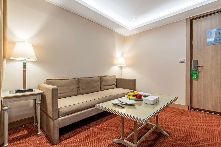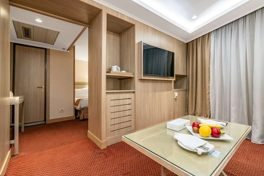 Suite К категории Suite относятся каюты: 201, 202. Двухкомнатная двухместная каюта со всеми удобствами, расположенная на второй палубе. Площадь каюты ≈ 28 м². Бутилированная вода доставляется в каюту ежедневно. Возможно размещение третьего человека на дополнительном спальном месте – диван.