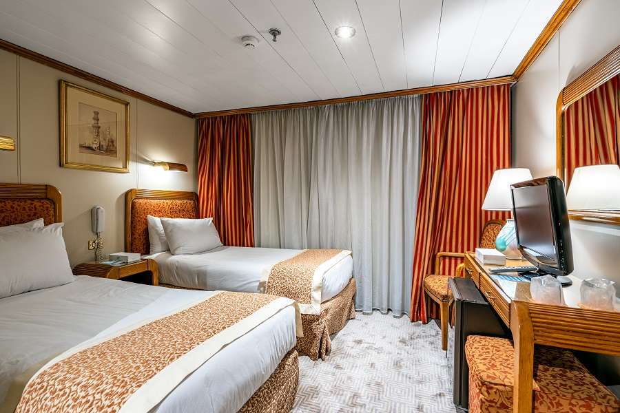 Во всех каютах: односпальная или двуспальная кровать (трансформируется в две односпальные); кондиционер, мини-бар (наполнение оплачивается отдельно), сейф, тумбочки, шкаф для одежды, стол, телевизор, телефон, бутилированная вода (доставляется в каюту ежедневно). В персональной ванной комнате: раковина, туалет, душ, фен.