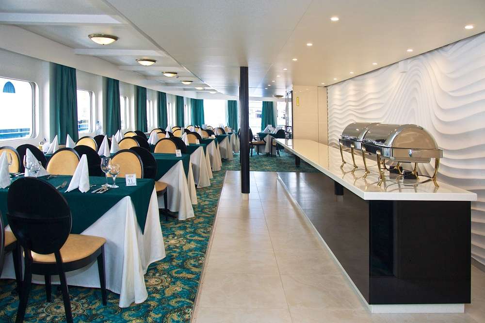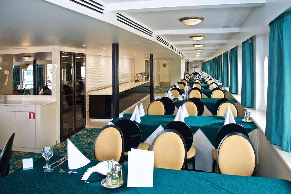 Трехразовое сбалансированное питание с возможностью выбора вегетарианских и низкокалорийных блюд включено в стоимость круиза. Проходит в ресторане в одну смену. Завтрак по системе «шведский стол», обед и ужин — по заказной системе. В баре большой выбор закусок, фруктов, алкогольных и безалкогольных напитков.