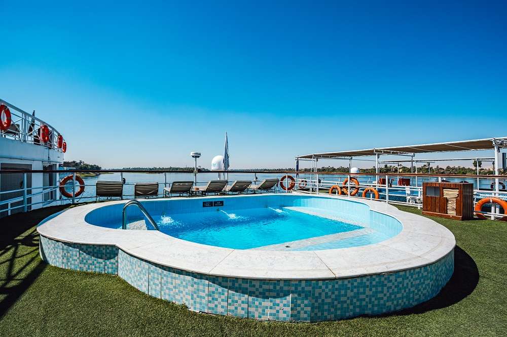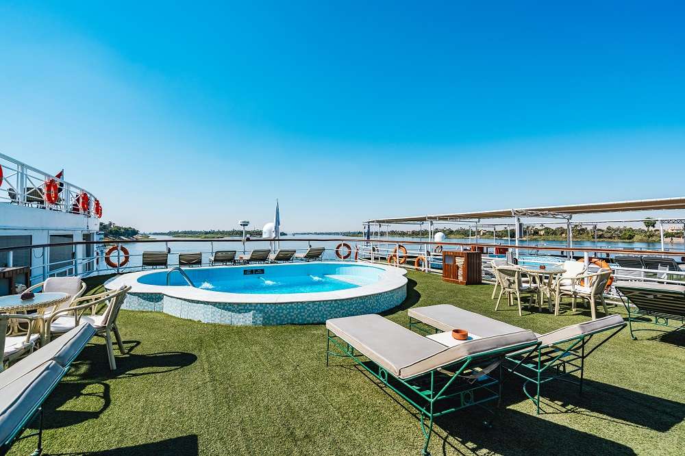 Терраса у бассейна с баром и удобными шезлонгами – место на самой верхней палубе, где можно принять солнечные ванны, читая культовый роман Агаты Кристи о нильском круизе. А после – окунуться в прохладную воду бассейна, и, потягивая напиток, насладиться великолепным видом на Нил.