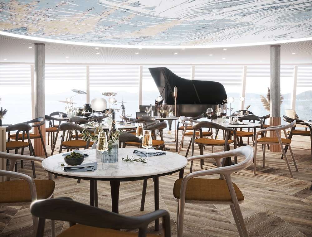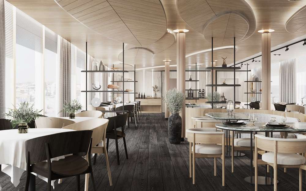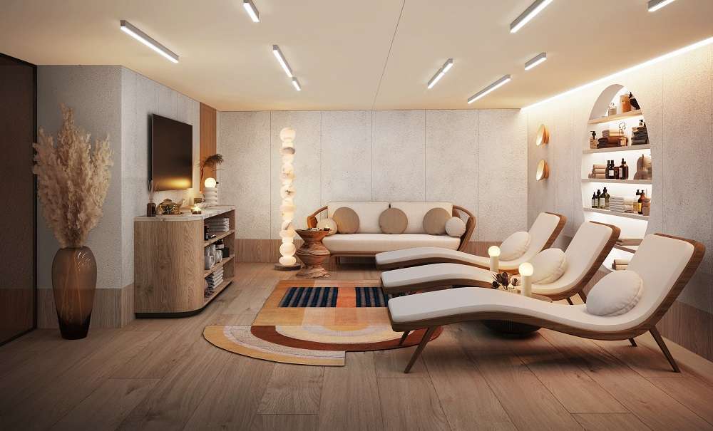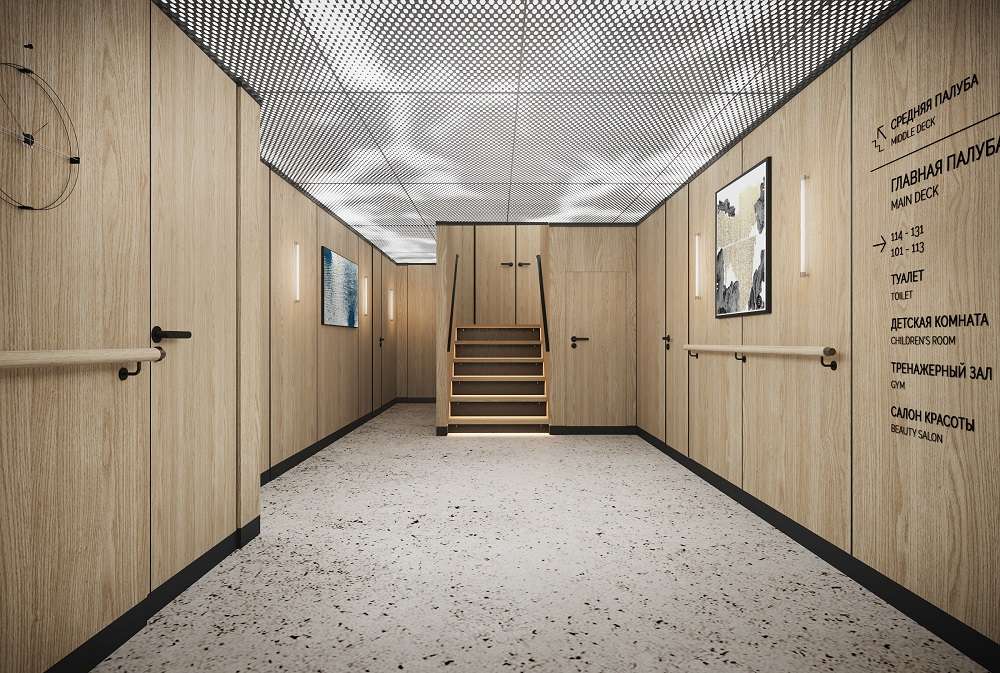 Для удобства гостей на борту общественные пространства и спальные зоны с каютами разделены. Стильный и лаконичный дизайн, цветовая гамма, сочетающаяся с небом и морем, элегантные атриумы с мягкой зоной, бесшумный лифт, плавные лестницы с подсветкой, панорамные окна – все это создает ощущение простора и комфорта.