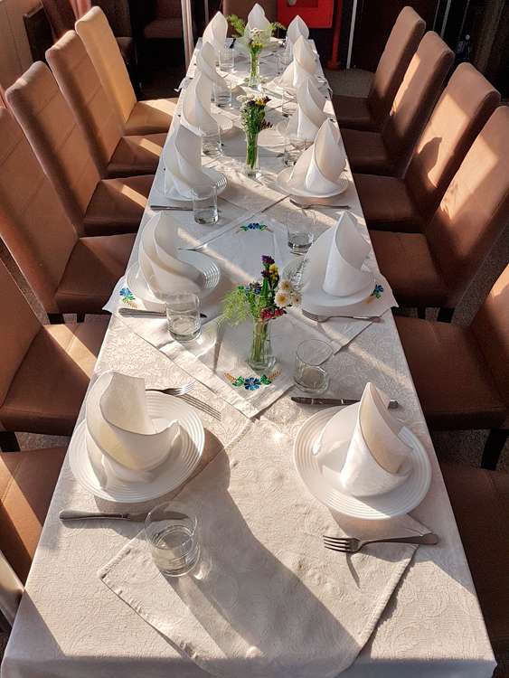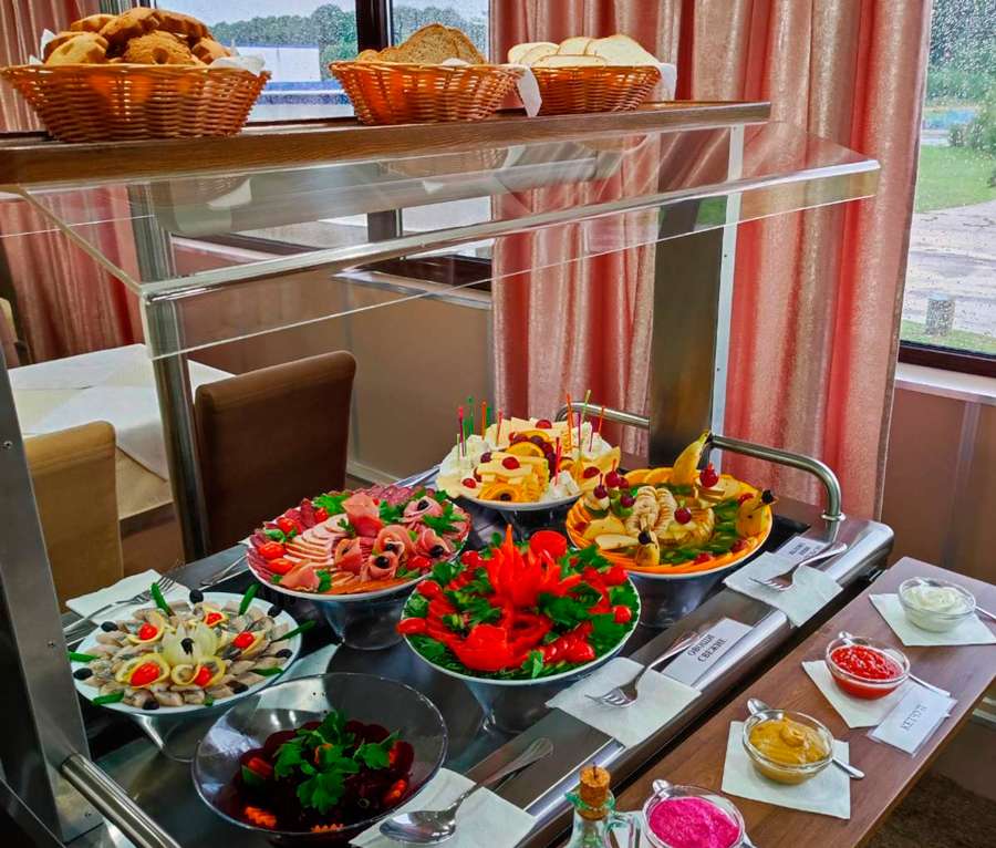 Панорамной ресторан на верхней палубе теплохода. Там организовано четырехразовое питание: завтрак, обед, дневное чаепитие и ужин. Повара готовят блюда белорусской и других кухонь мира.