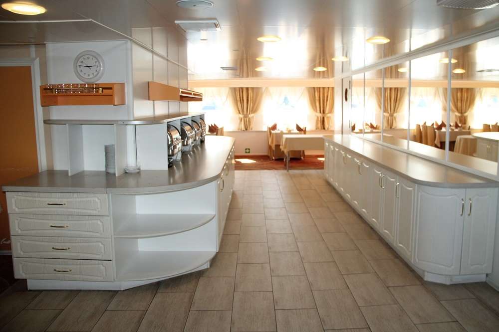 Туристов приятно удивит высокий уровень сервиса в ресторане и барах. В стоимость круизов теплохода включено трехразовое питание: завтрак — по системе шведского стола, обед и ужин — по заказному меню. Возможность выбора вегетарианских и низкокалорийных блюд: