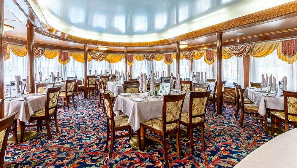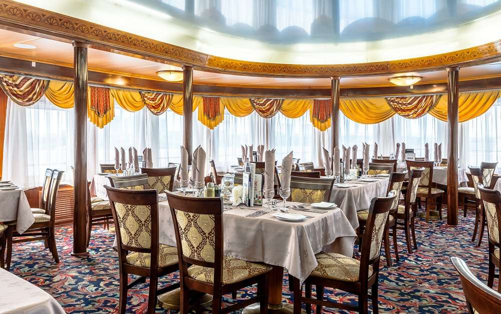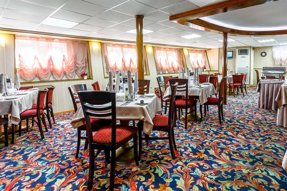 На всех теплоходе  действует единая концепция питания.  Если у вас имеются особые требования к питанию или противопоказания на определённые продукты, сообщите об этом  персоналу, и блюдо будет приготовлено индивидуально. По запросу в ресторане есть диетическое и безглютеновое меню. В обзорном лаундж-баре вам предложат напитки, десерты, холодные и горячие закуски.