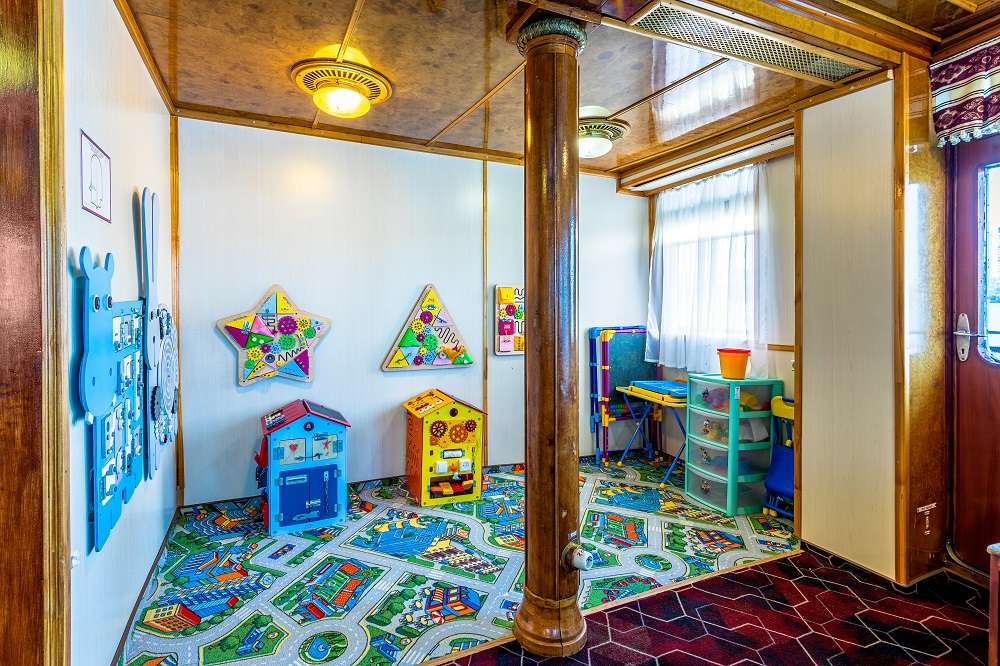 Для детей на борту проводят интерактивную анимационную программу с развлекательными играми. Есть специальное меню и стульчики в ресторане, а также детский уголок в панорамном салоне.