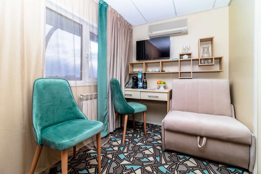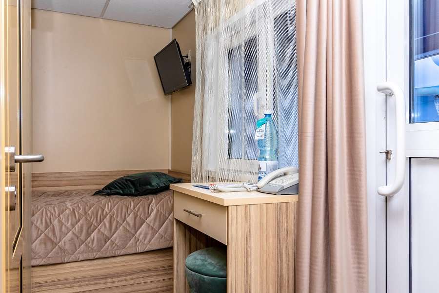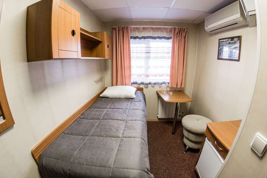 В каюте: односпальная кровать, ванная комната (раковина, душ, туалет), шкаф, тумба, пуф, стол, настенная полка, кондиционер, телевизор с кабельным и спутниковым вещанием, холодильник, телефон внутренней связи, розетки 220 V, радио, фен, плед, щетка для одежды, обзорное окно.