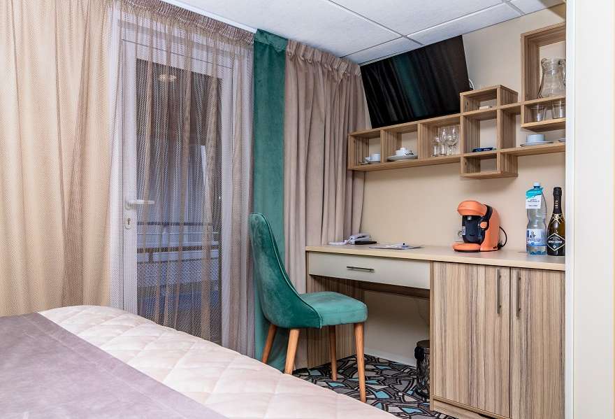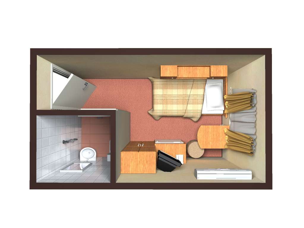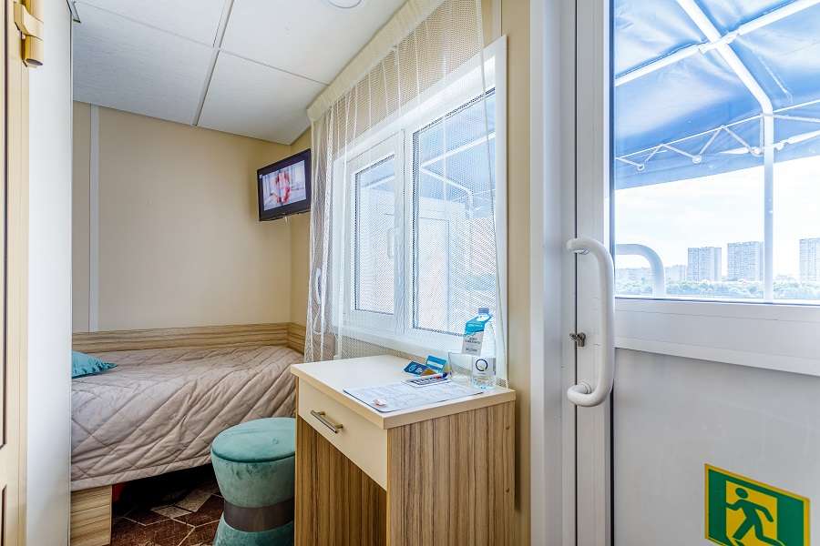 В каюте: односпальная кровать, ванная комната (раковина, душевая кабина, туалет), шкаф, тумба, пуф, стол, настенная полка, телевизор с кабельным и спутниковым вещанием, холодильник, кондиционер, телефон внутренней связи, розетки 220 V, радио, фен, плед, щетка для одежды, обзорное окно.