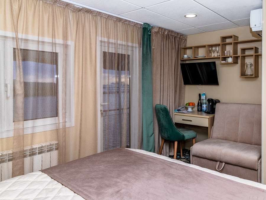 В каюте: две односпальные кровати и одно спальное место верхнего расположения, ванная комната (раковина, душевая кабина, туалет), шкаф, тумба, пуф, стол, кондиционер, холодильник, розетки 220 V, радио, телевизор с кабельным и спутниковым вещанием, фен, плед для каждого туриста, щетка для одежды, иллюминаторы.