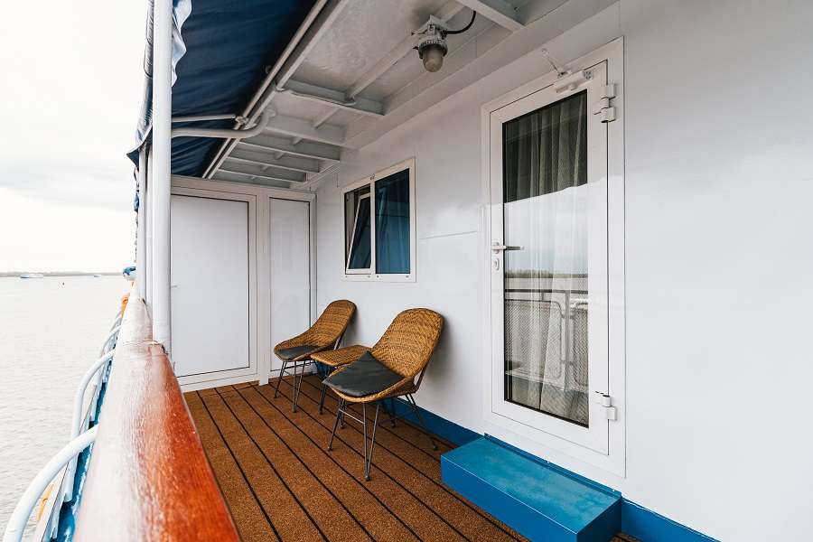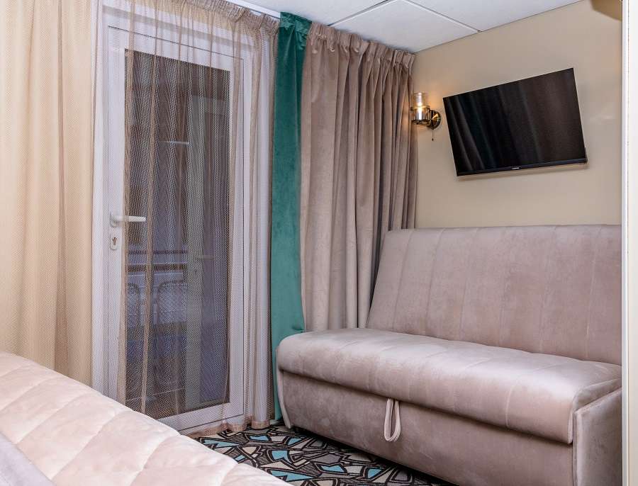 В каюте: двуспальная кровать (при необходимости трансформируется в две односпальные кровати), ванная комната (раковина, душевая кабина, туалет), шкаф, настенная полка, кресло, туалетный стол, прикроватные тумбы, вешалка для верхней одежды, кондиционер, телевизор с кабельным и спутниковым вещанием, холодильник, сейф, телефон внутренней связи, розетки 220 V, фен, плед для каждого туриста, обзорное окно, персональный балкон с мебелью для отдыха.