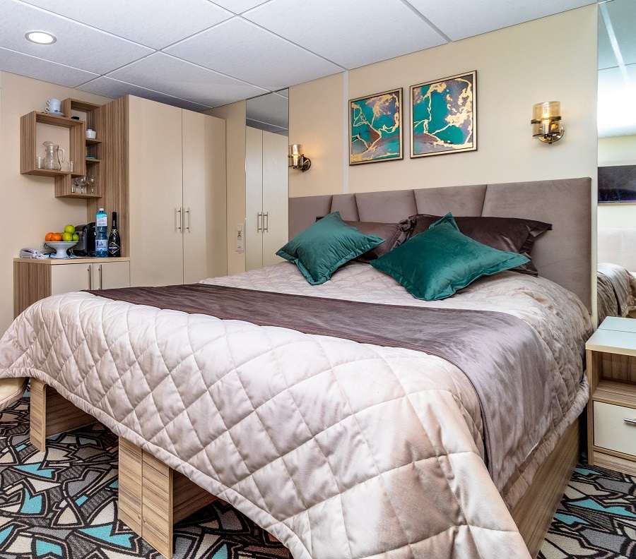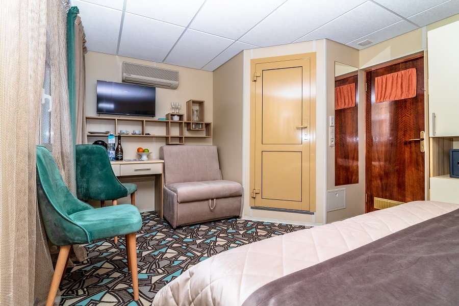 В каюте: двуспальная кровать (при необходимости трансформируется в две односпальные кровати) и кресло-кровать (1 спальное место), ванная комната (раковина, душевая кабина, туалет), шкаф, прикроватные тумбы, два кресла, туалетный стол, книжная полка, вешалка для верхней одежды, кондиционер, телевизор с кабельным и спутниковым вещанием, холодильник, сейф, телефон внутренней связи, розетки 220 V, фен, плед для каждого туриста, обзорные окна