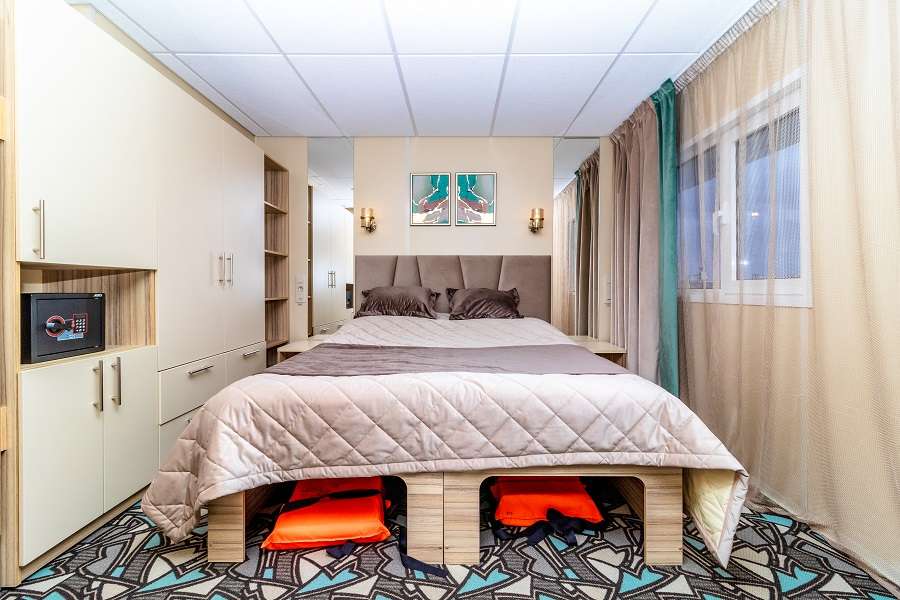 В каюте: односпальная кровать, двуспальный диван, ванная комната (раковина, душевая кабина, туалет), шкаф, тумба, пуф, стол, настенная полка, сейф, телевизор с кабельным и спутниковым вещанием, холодильник, кондиционер, телефон внутренней связи, фен, плед для каждого туриста, розетки 220 V, радио, обзорные окна.