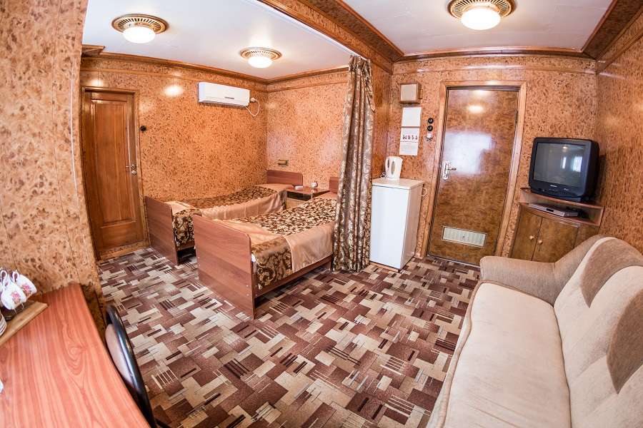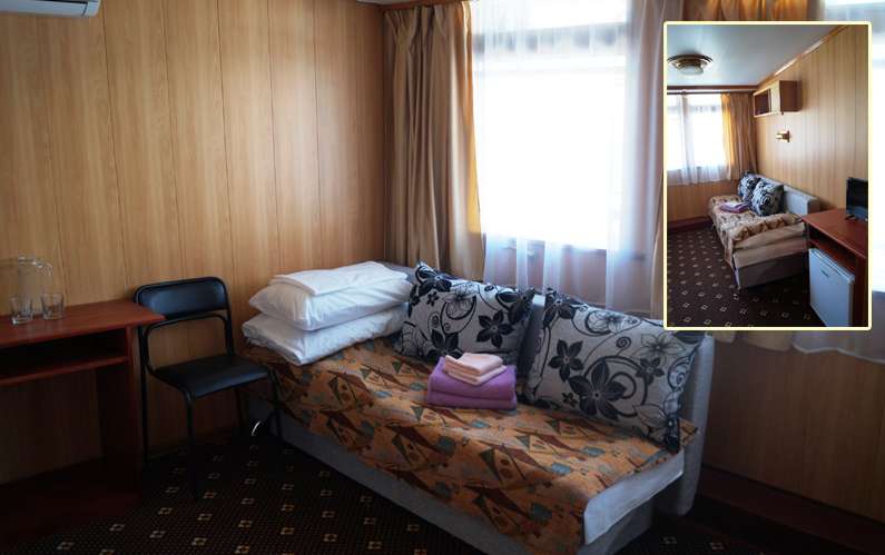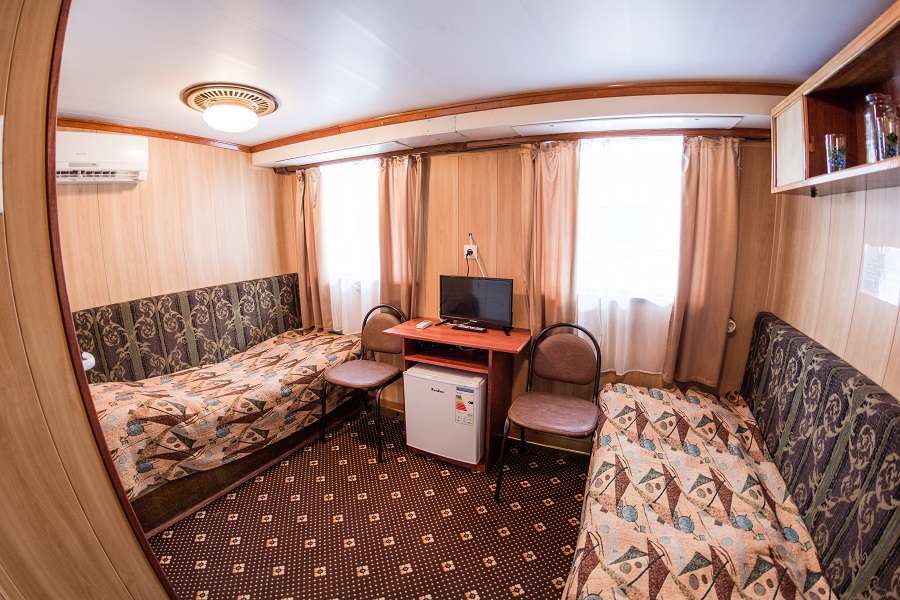 В каюте: спальное место раскладной диван, шкаф, стол-тумба, телевизор, радио, кондиционер, холодильник, розетки 220V, туалетные принадлежности (шампунь, мыло, гель для душа), два обзорных окна.