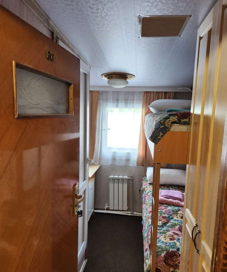 В каюте: спальное место двухъярусная кровать, стул, стол, надкроватные светильники, радио, розетки 220V, туалетные принадлежности (шампунь, мыло, гель для душа), два открывающихся иллюминатора.