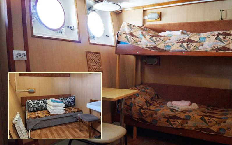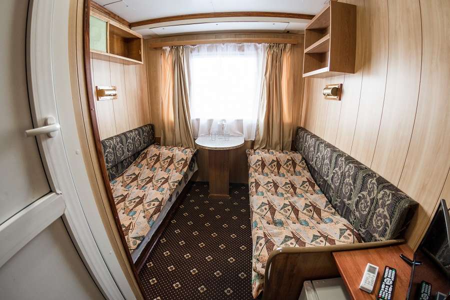 В каюте: два односпальных дивана, стул, стол, радио, розетки 220V, туалетные принадлежности (шампунь, мыло, гель для душа), два открывающихся иллюминатора, каюта стандартной площади.