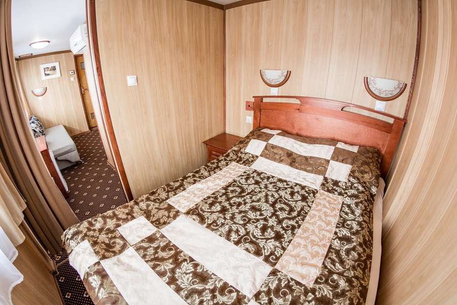 В каюте: спальное место двуспальный диван и двухъярусная кровать (возможно размещение 2-х дополнительных туристов), полка, два стула, два стола, надкроватные светильники, радио, розетки 220V, туалетные принадлежности (шампунь, мыло, гель для душа), четыре открывающихся иллюминатора, каюта увеличенной площади.