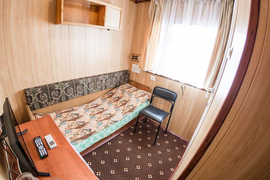 В каюте: спальное место односпальная кровать, шкаф, стол-тумба, телевизор, радио, кондиционер, холодильник, розетки 220V, туалетные принадлежности (шампунь, мыло, гель для душа), обзорное окно.
