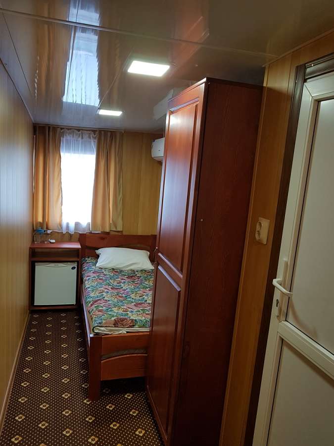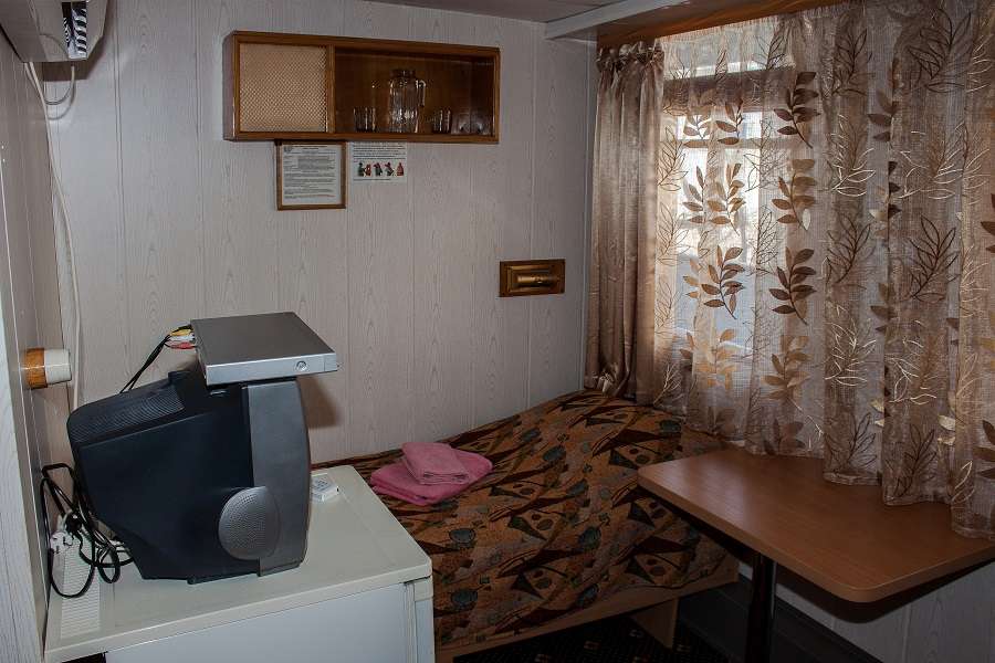 В каюте: спальное место односпальная кровать, шкаф, телевизор, радио, кондиционер, холодильник, розетки 220V, туалетные принадлежности (шампунь, мыло, гель для душа), два открывающихся иллюминатора.