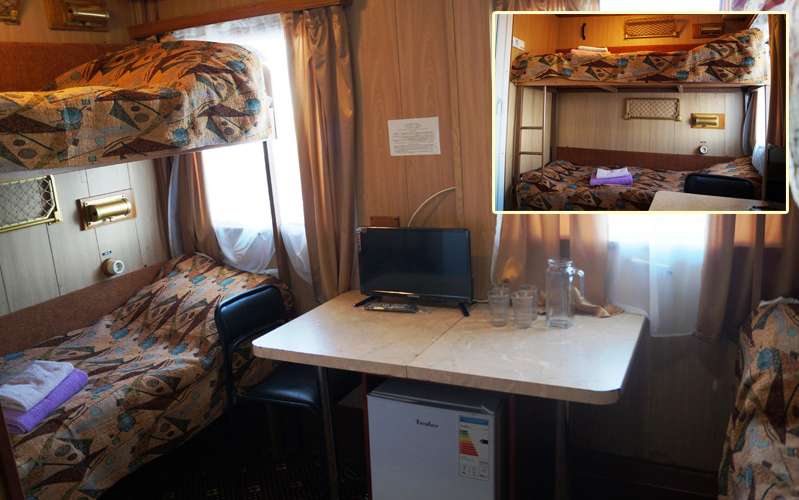 В каюте: спальное место две двухъярусные кровати (возможно размещение 2-х дополнительных туристов), шкаф, стол, стул, надкроватные светильники, телевизор, радио, холодильник, розетки 220V, туалетные принадлежности (шампунь, мыло, гель для душа), два обзорных окна.
