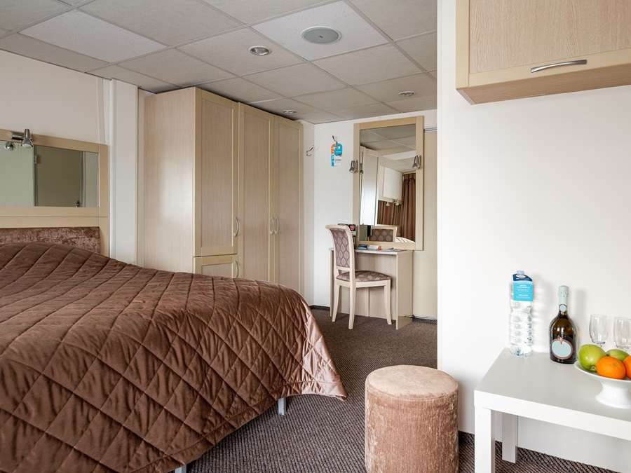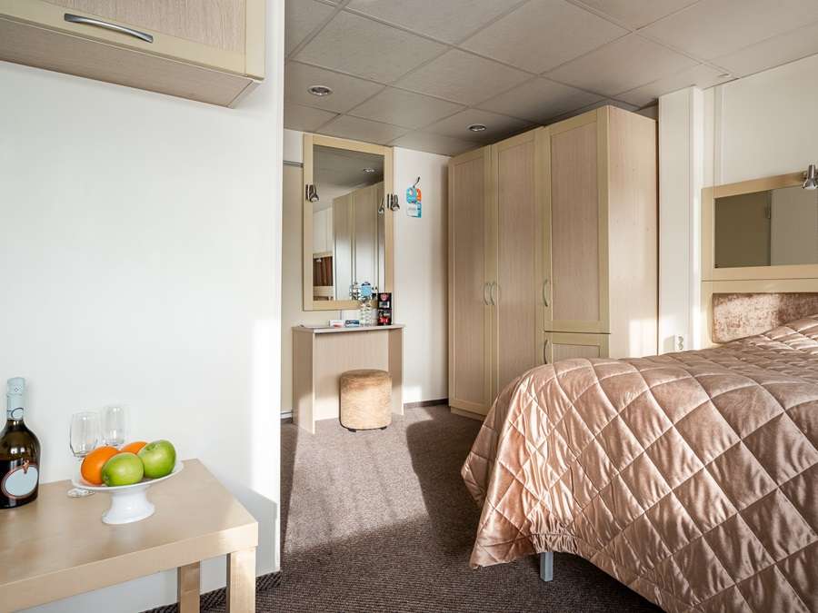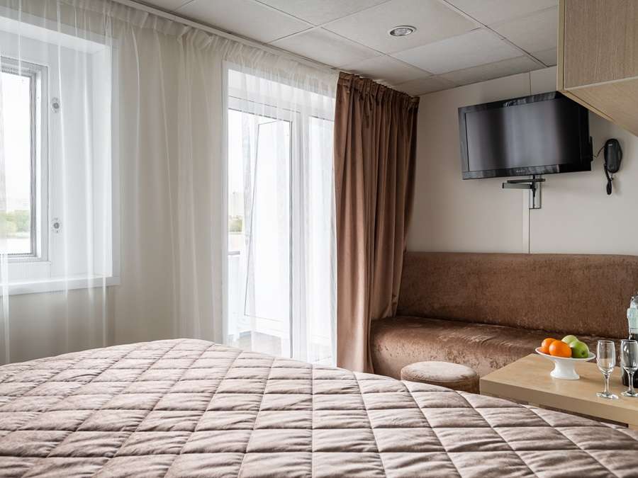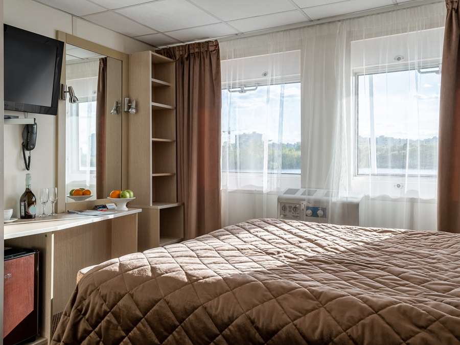 В каюте: одна двуспальная кровать (при необходимости трансформируется в две односпальные кровати), ванная комната (раковина, душ, туалет), прикроватные тумбы, пуф, стол, зеркало, холодильник, телефон, сейф, кондиционер, радио, шкаф, вешалка для верхней одежды, фен, плед для каждого туриста, телевизор с кабельным и спутниковым вещанием, розетки 220V, обзорное окно.