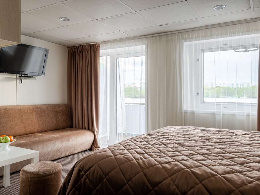 В каюте: одна двуспальная кровать (при необходимости трансформируется в две односпальные кровати), ванная комната (раковина, душевая кабина, туалет), прикроватная тумба и комод, стол, два кресла, шкаф, зеркало, вешалка для верхней одежды, холодильник, кондиционер, сейф, телевизор с кабельным и спутниковым вещанием, радио, фен, розетки 220 V, плед для каждого туриста, панорамные окна.