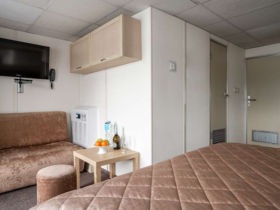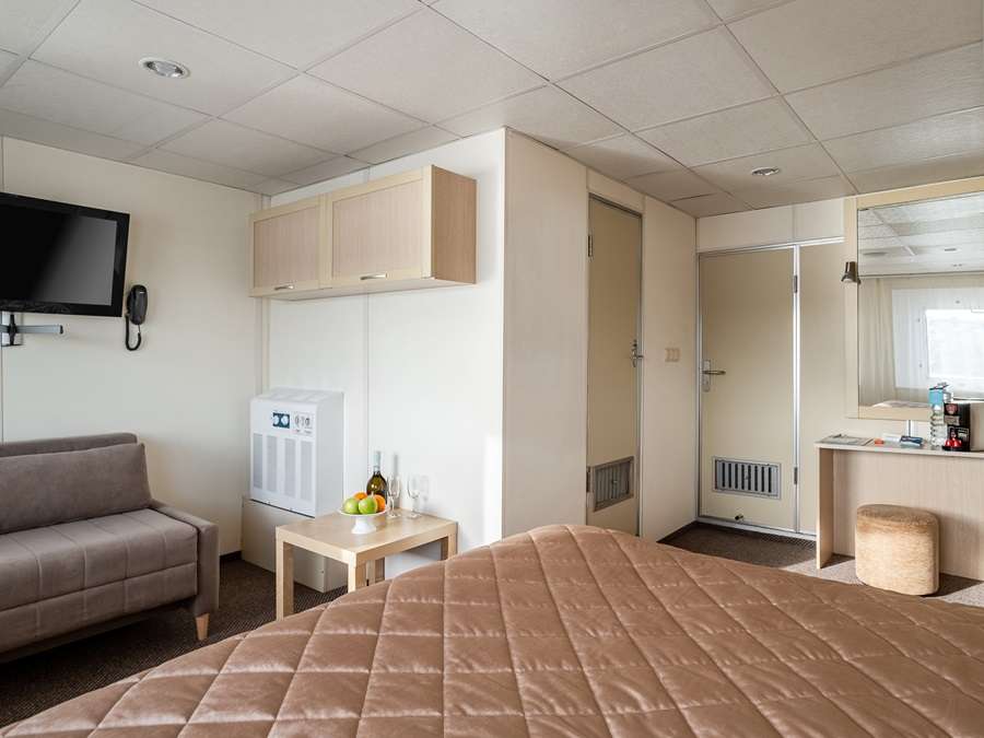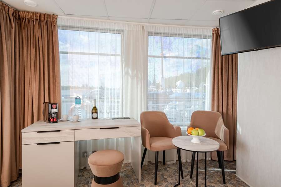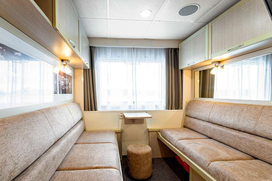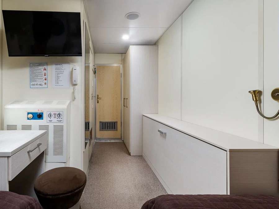 В каюте: одна двуспальная кровать (при необходимости трансформируется в две односпальные кровати), двуспальный диван, ванная комната (раковина, душ, туалет), прикроватные тумбы, пуф, стол, зеркало, сейф, холодильник, кондиционер, радио, шкаф, вешалка для верхней одежды, фен, индивидуальный плед, телевизор с кабельным и спутниковым вещанием, розетки 220V, обзорное окно.