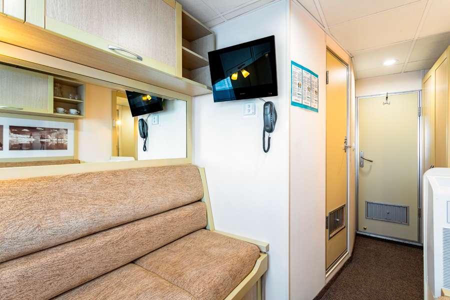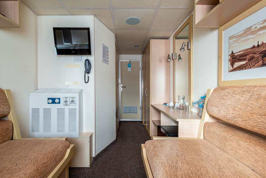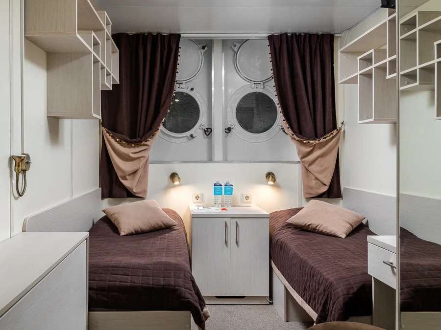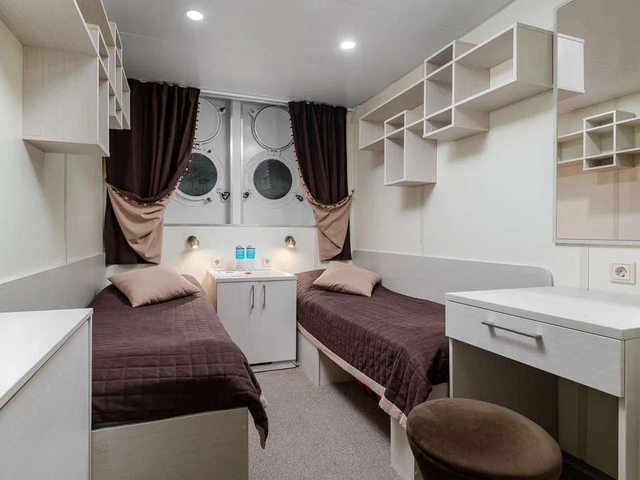 В каюте: две односпальные кровати, ванная комната (душ, раковина, туалет), шкаф, вешалка для верхней одежды, стол, два пуфа, зеркало, кондиционер, холодильник, радио, телевизор с кабельным и спутниковым вещанием, телефон, фен, розетки 220V, щетка для одежды, индивидуальный плед, питьевая вода, иллюминаторы.