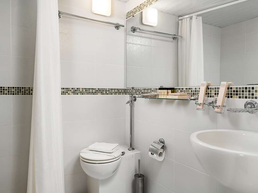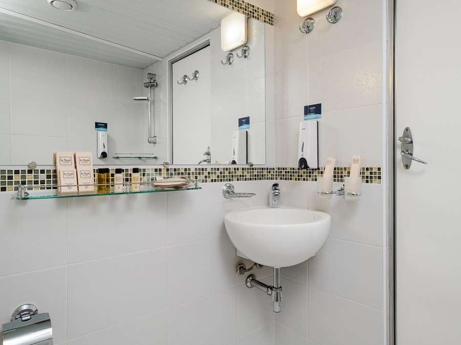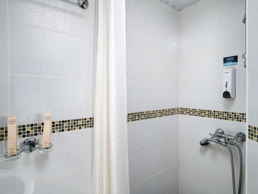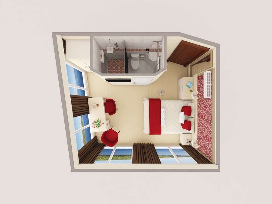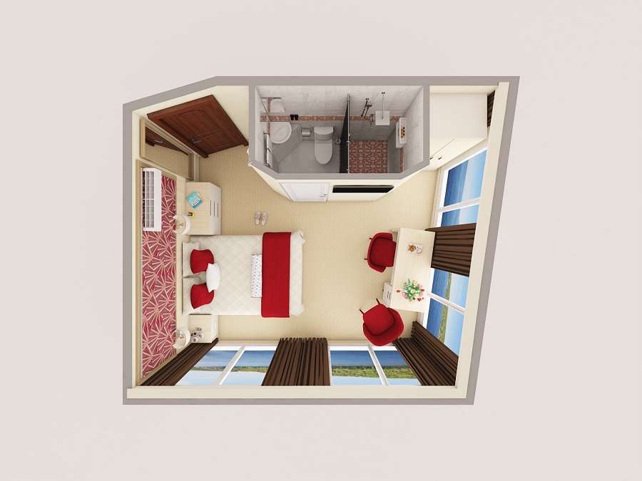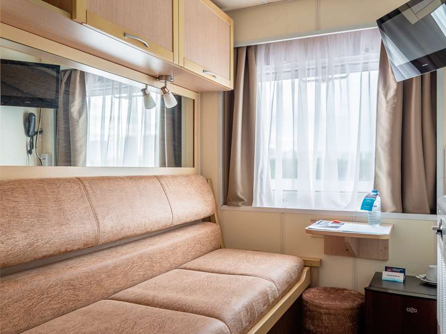 В каюте: односпальная кровать, ванная комната (раковина, душ, туалет), шкаф для одежды, стол, мягкий пуф, зеркало, вешалка для верхней одежды, настенная полка, радио, телевизор с кабельным и спутниковым вещанием, телефон, сейф, фен, холодильник, индивидуальный плед, тапочки, набор посуды, розетки на 220V, щетка для одежды, кондиционер, обзорное окно.