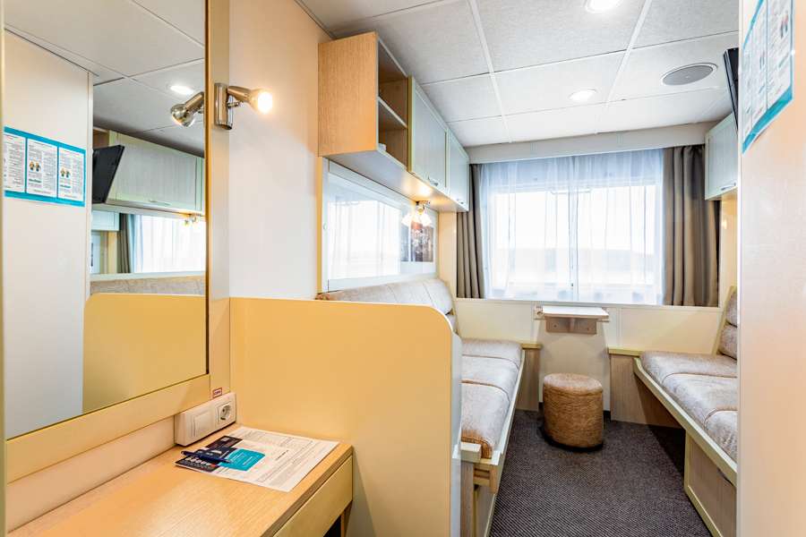 В каюте: две односпальные кровати, ванная комната (раковина, душ, туалет), шкаф для одежды, стол, мягкий пуф, зеркало, вешалка для верхней одежды, настенная полка, радио, телевизор с кабельным и спутниковым вещанием, телефон, сейф, фен, холодильник, индивидуальный плед, тапочки, набор посуды, розетки 220V, щетка для одежды, кондиционер, обзорное окно.