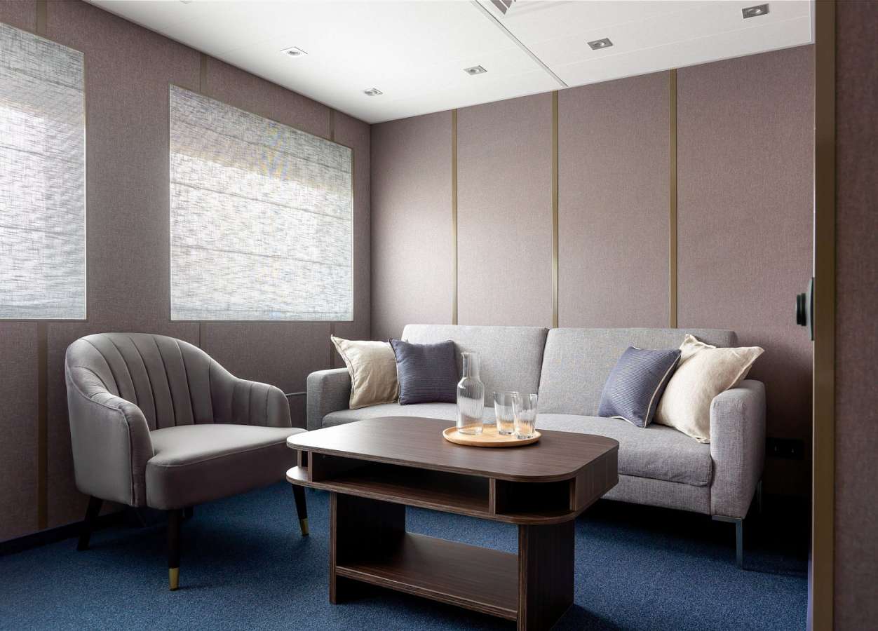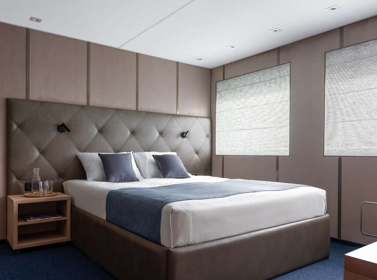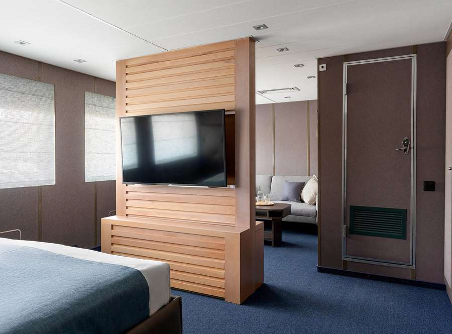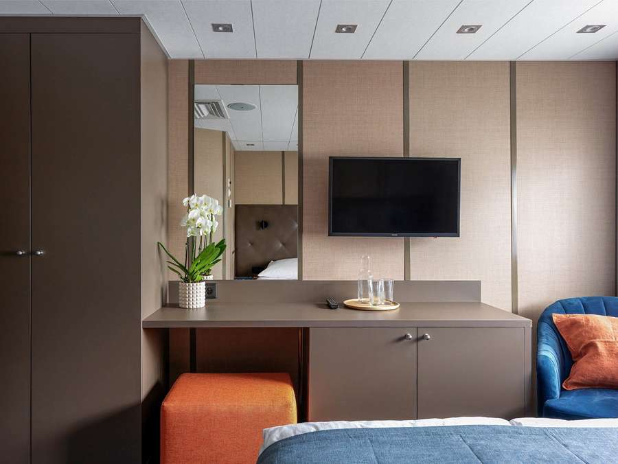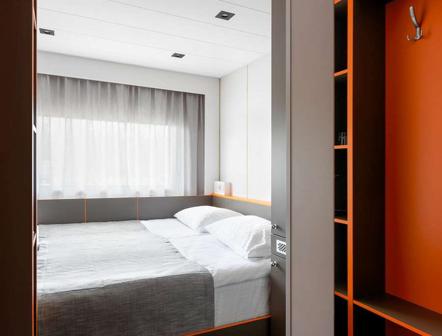 Для комфортного размещения туристов на борту представлены каюты разных категорий: «Люкс», «Делюкс», одноместные, двухместные одноярусные и трехместные двухъярусные каюты. Во всех каютах: кондиционер, TV, сейф, холодильник, душ, санузел, тапочки и фен.