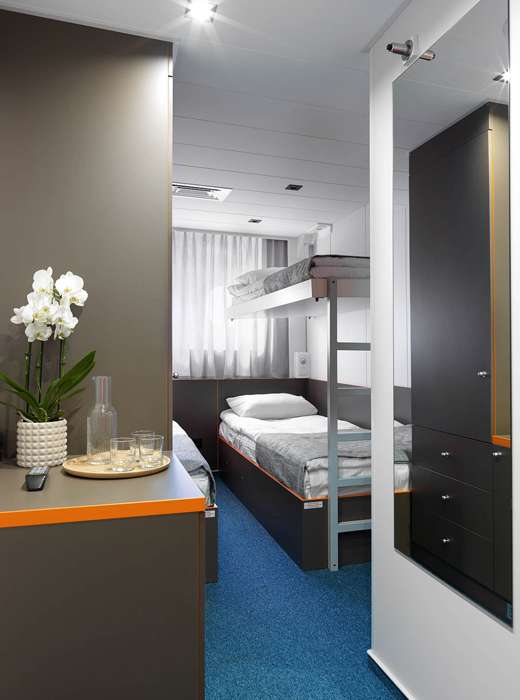К категории 3-местная (нижняя палуба) относятся каюты: 108–117. Трехместная двухъярусная каюта со всеми удобствами, расположенная на нижней палубе.