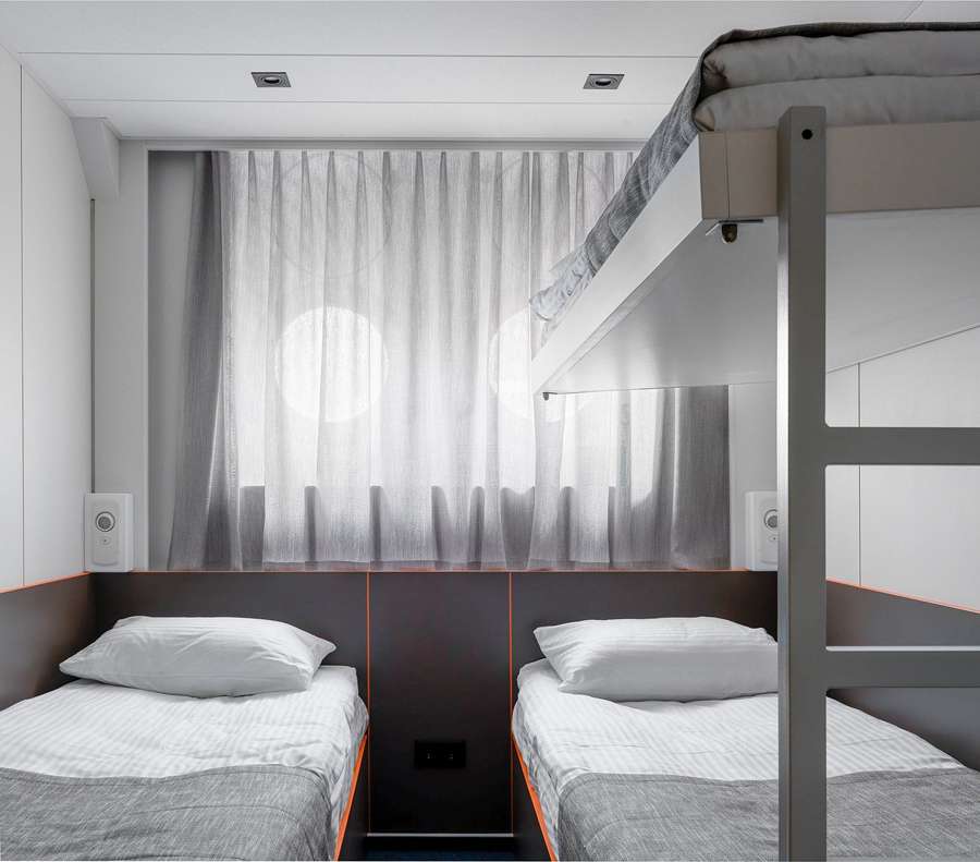 В каюте три спальных места, шкаф для одежды, холодильник, телевизор, радио, душ, санузел, кондиционер, фен, два иллюминатора, электророзетка на 220V.