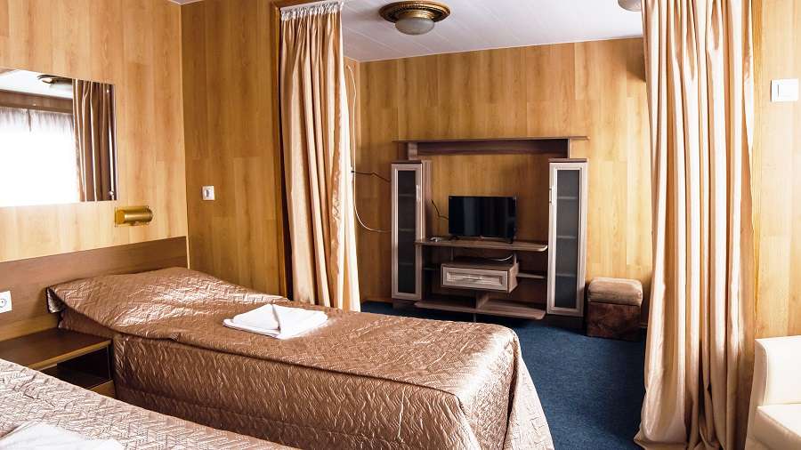 В каюте: две односпальные кровати и одно спальное место верхнего расположения, ванная комната (раковина, душ, туалет), кондиционер, шкаф для одежды, стол, мини-холодильник, радио, розетка 220V, обзорное окно.