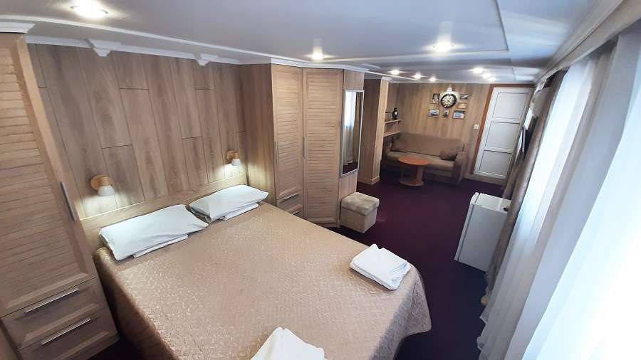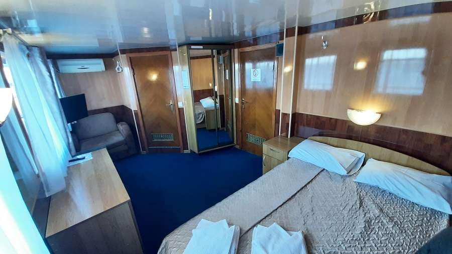 В каюте: двуспальная кровать, диван, ванная комната (раковина, душ, туалет), кондиционер, шкаф для одежды, стол, мини-холодильник, телевизор, радио, розетка 220V, два обзорных окна.