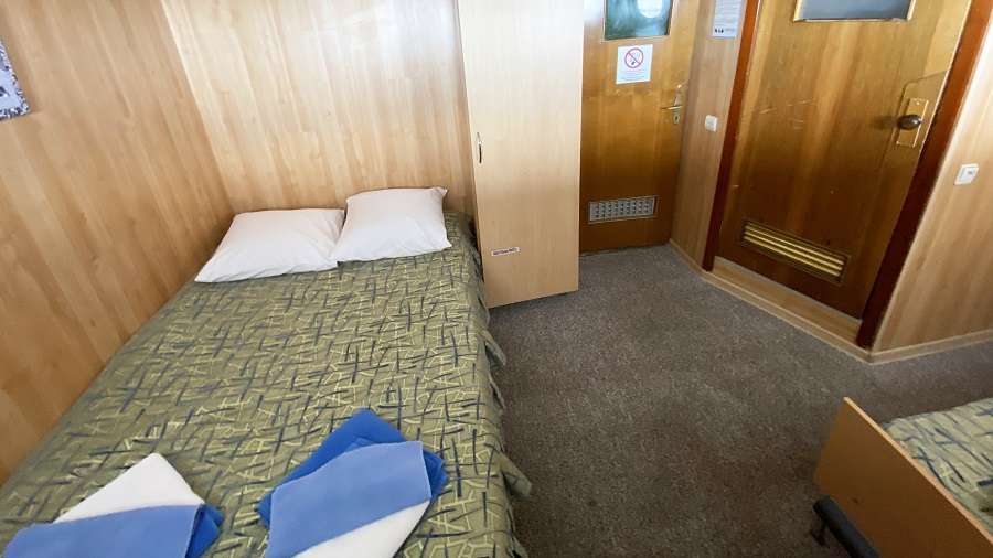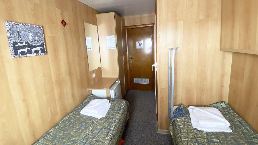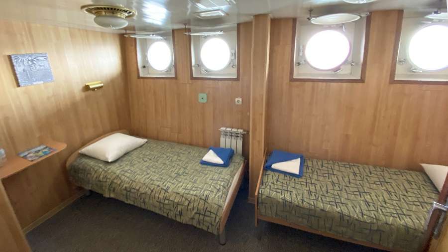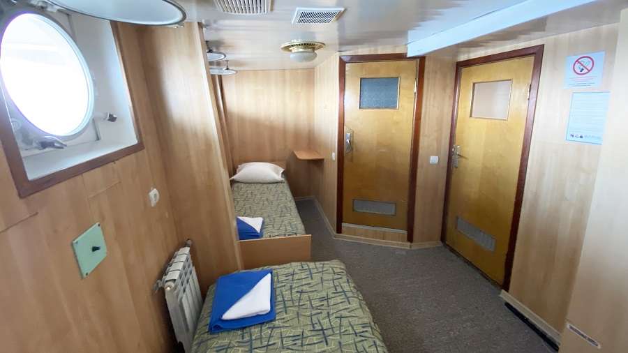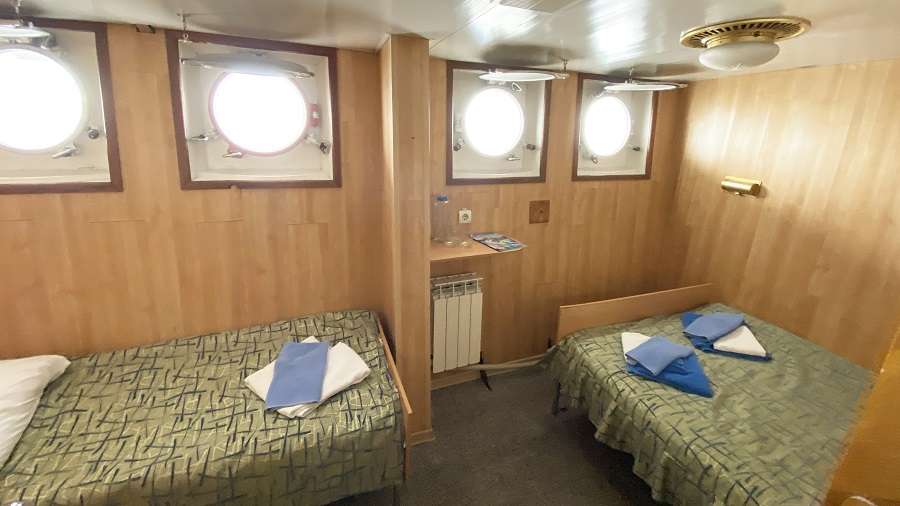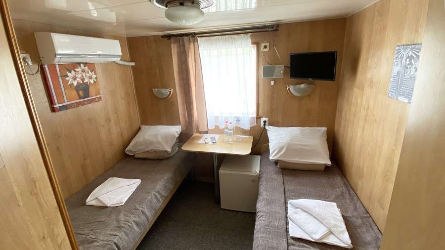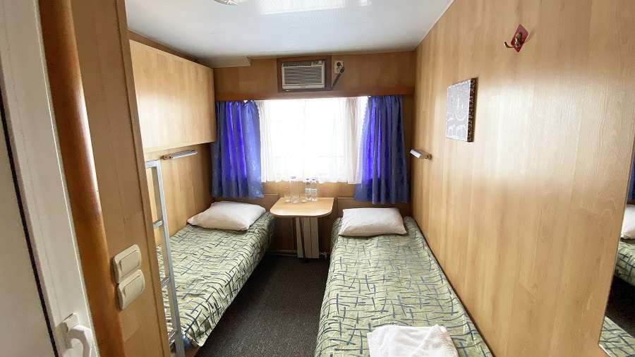 В каюте: две односпальные кровати, ванная комната (раковина, душ, туалет), шкаф для одежды, стол, радио, розетка 220V, иллюминаторы.