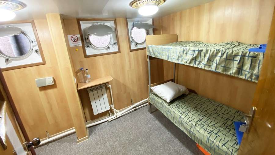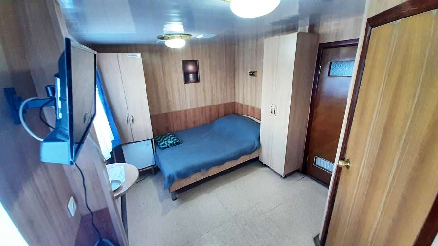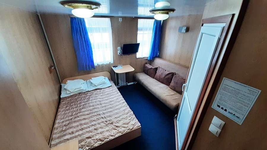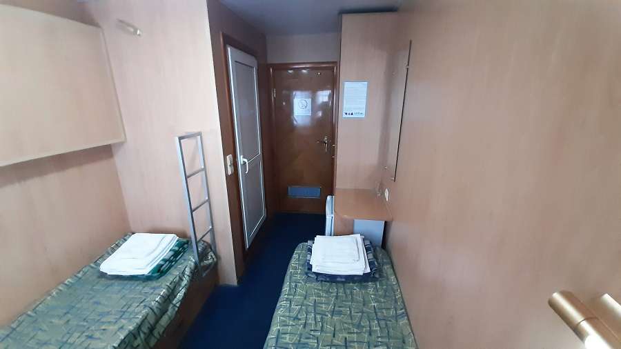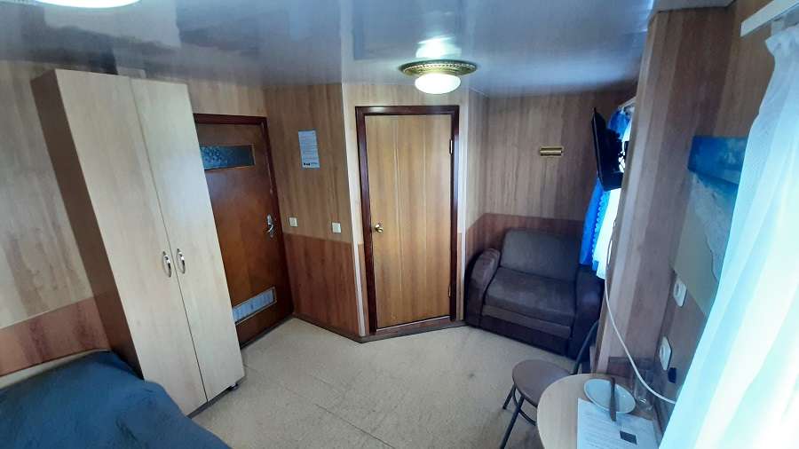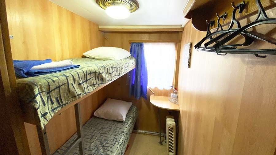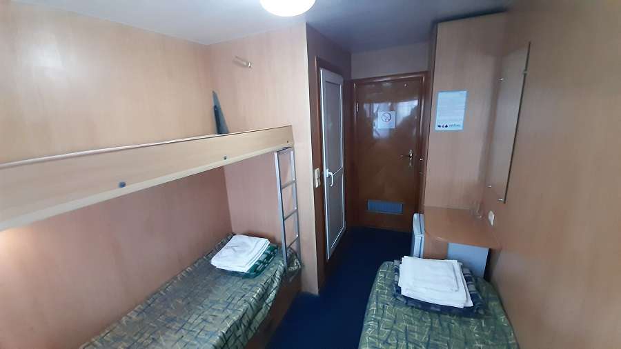 В каюте: двухъярусная кровать, раковина, вешалка для верхней одежды, стол, радио, розетка 220 V, обзорное окно.