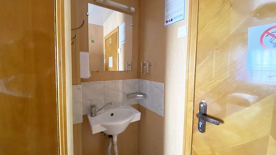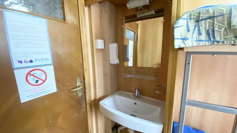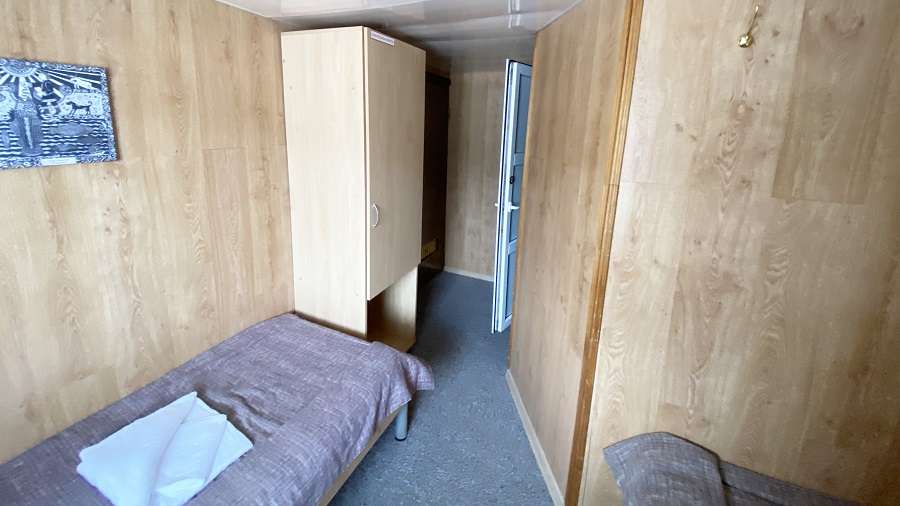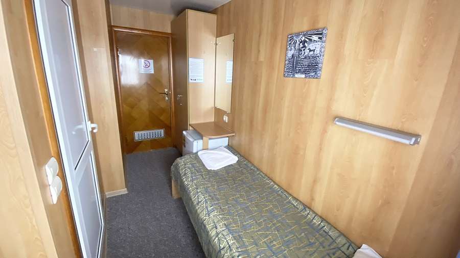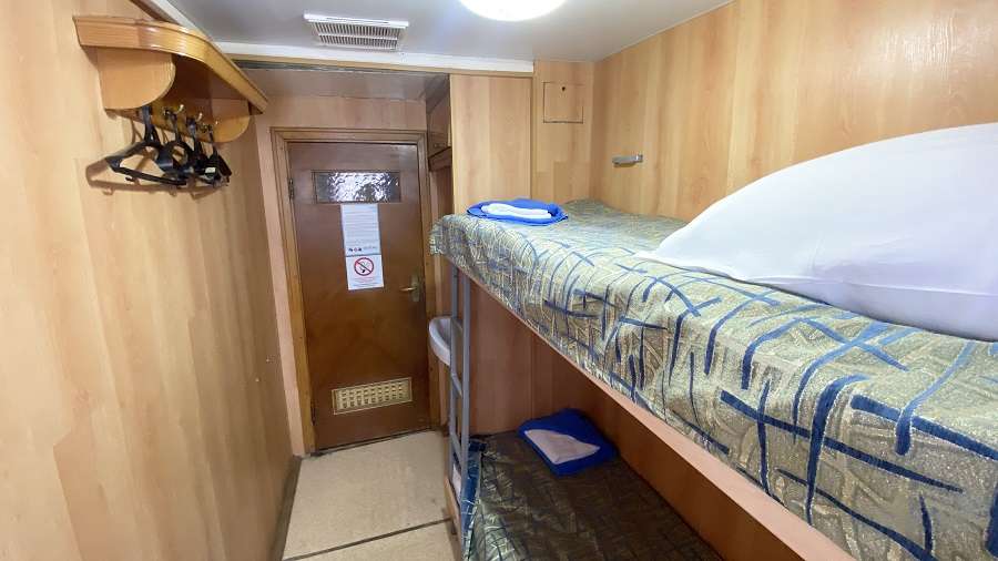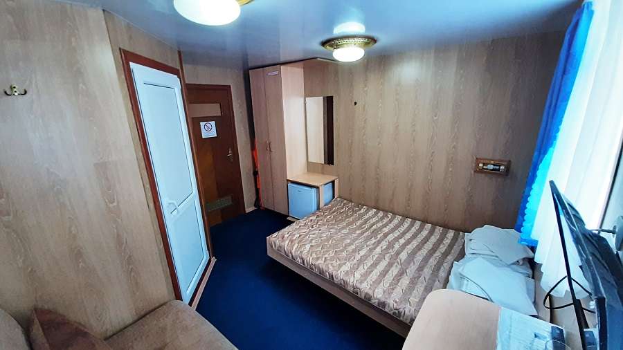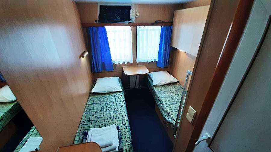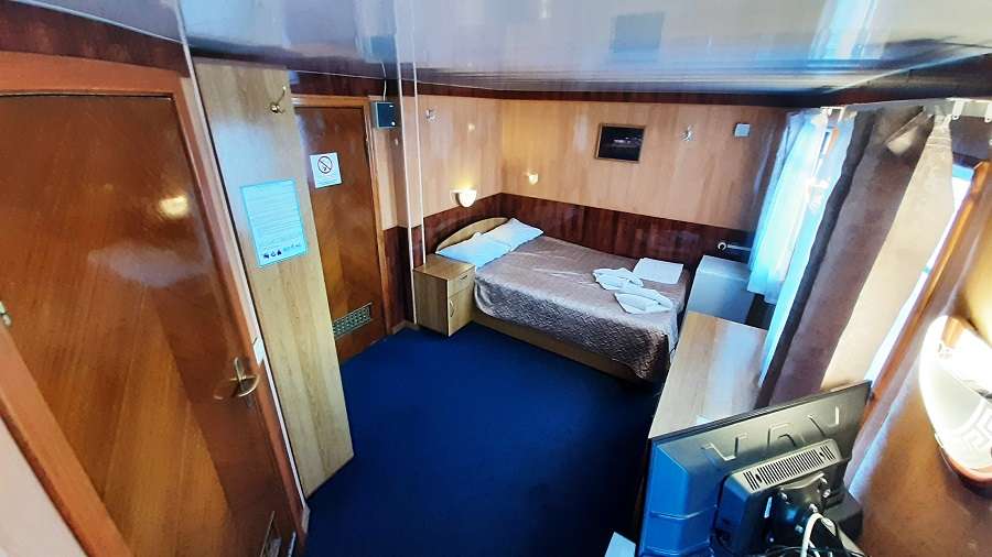 В каюте: двухъярусная кровать, раковина, вешалка для верхней одежды, стол, радио, розетка 220 V, обзорное окно.