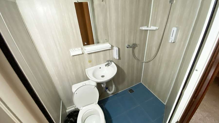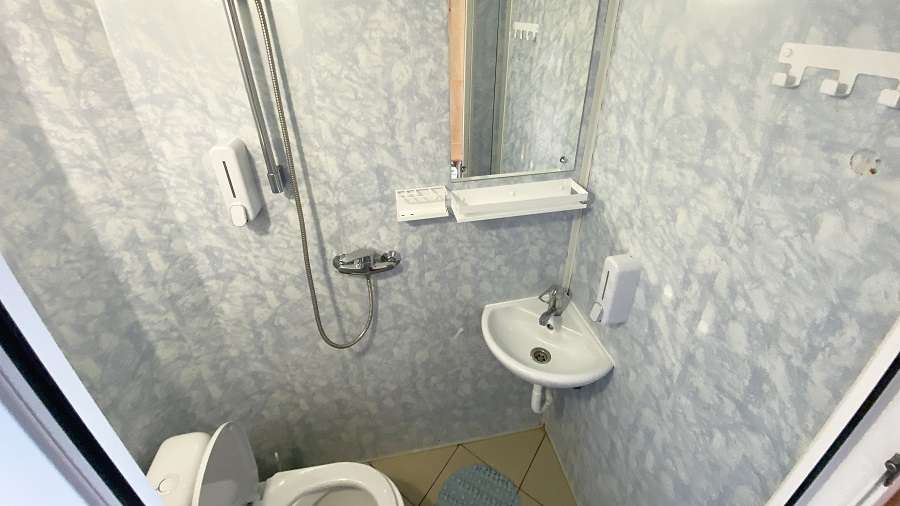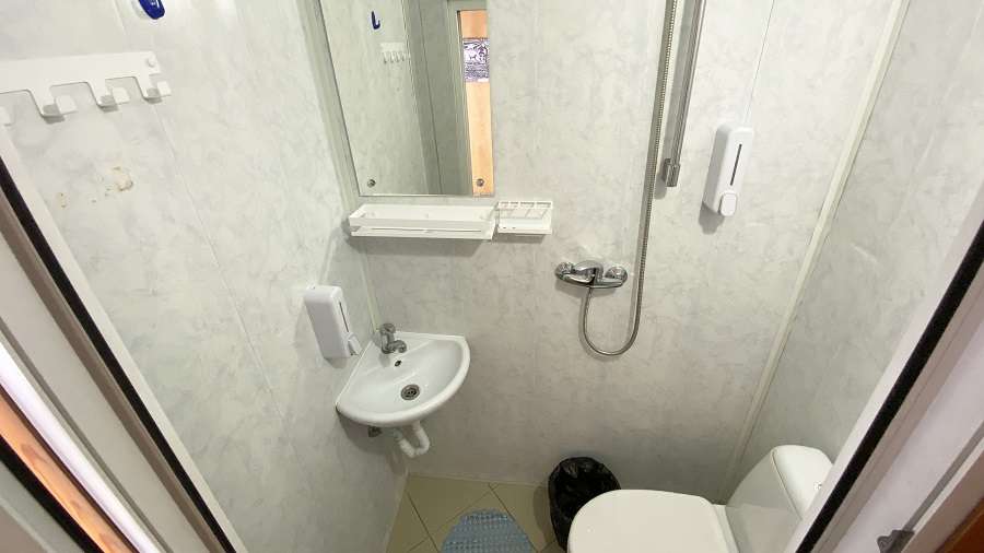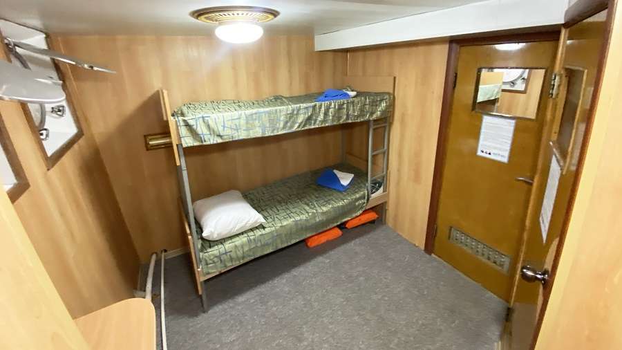 В каюте: двухъярусная кровать, ванная комната (раковина, душ, туалет), шкаф для одежды, стол, радио, розетка 220 V, иллюминаторы.