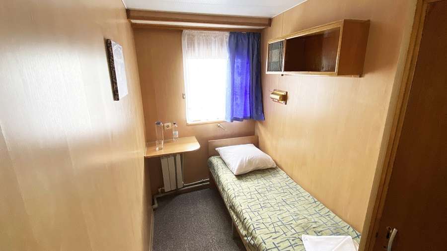 В каюте: односпальная кровать, раковина, шкаф для одежды, стол, радио, розетка 220 V, обзорное окно.