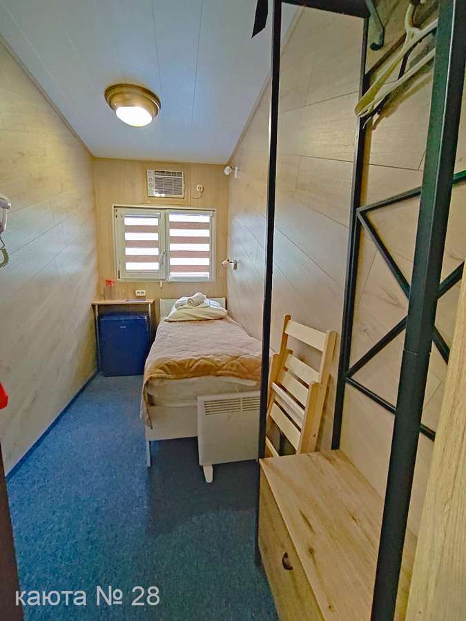 В каюте: туалет, душ, холодильник, верхняя и нижняя полки, обзорное окно.